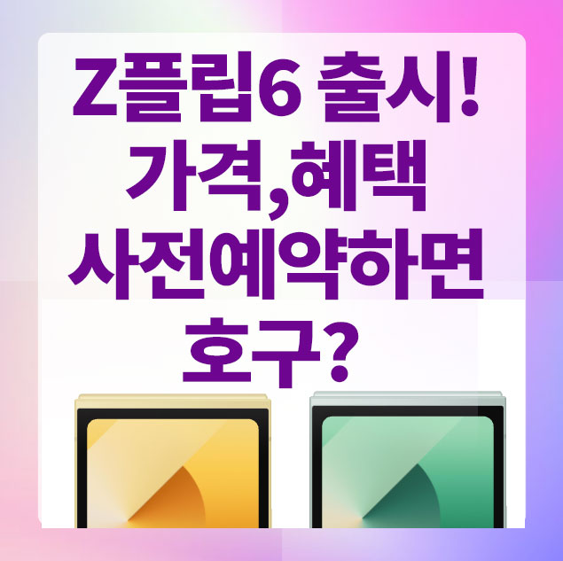 삼성의 최신폰 갤럭시Z플립6가 출시됩니다. 사전예약은 7월 12일부터 시작되며 개통은 19일부터 시작입니다. 플립모델은 반으로 접히는 스마트폰으로 MZ세대까지 두루 인기를 얻었는데요, 많이 궁금해하는 전작 Z플립5와의 차이점, 가격, 할인혜택, 사전예약등에 대해 자세히 알아보겠습니다.