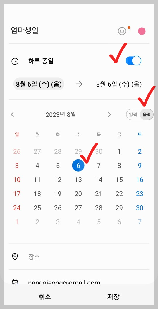 이제 매년 음력 8월 6일이면 달력어플이 알아서 양력으로 환산하여 알림을 해줄 것입니다.