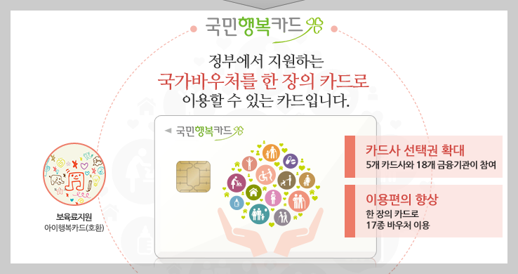 국민행복카드란, 정부에서 지원하는 다양한 국가바우처를 하나의 카드로 통합한 통합국가바우처 카드입니다. 임신출산비 지원(100만원)은 물론 기저귀, 조제분유, 첫만남 이용권, 에너지바우처, 보육료, 유아학비 지원등 다양한 바우처를 생애 주기에 따라 등록하여 사용할 수 있기 때문에 한번만 발급해두면 다양한 혜택들을 받을 수 있습니다. 연회비는 없습니다.