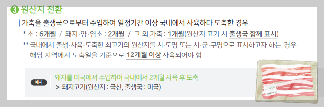 예를들면 미국산 돼지를 수입하여 2개월 이상 가축 후 도축하여 판매하면 돼지 국산(국내산)으로 표시할 수 있습니다.