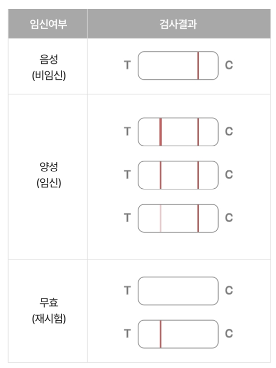 대조선과 검사선이 있는데 오른쪽의 대조선은 보통 2~3분 후에 나타나며 왼쪽의 검사선 줄의 유무에 따라 임신여부를 판독하게 됩니다. 한줄만 나타나면 비임신이며 희미하게라도 왼쪽의 검사선이 보인다면 임신입니다. 두줄이 다 안보이거나 검사선만 줄이 보인다면 불량인 경우로 무효이므로 재검사를 해야 합니다.