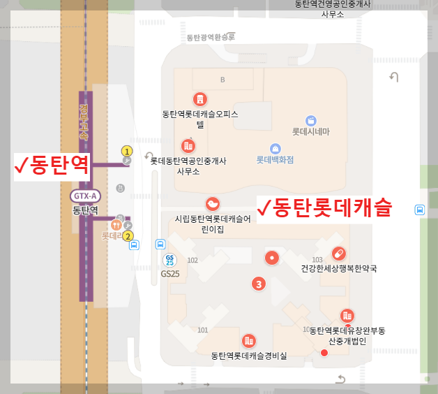 동탄롯데캐슬은 아래 지도에서 보다시피 동탄역에 딱 붙어있는 초역세권 단지입니다.