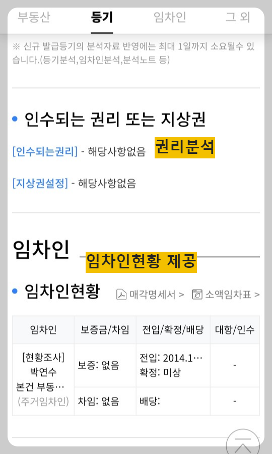 이는 유료경매사이트에서 제공하는 권리분석과 크게 차이가 나지 않습니다.