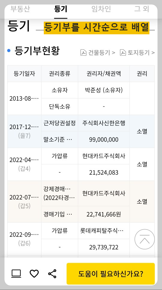 하지만 경매마당에서는 등기부현황을 제공하여 등기부등본의 내용을 시간순으로 배열하여 권리분석이 쉽도록 도와주고 있습니다.