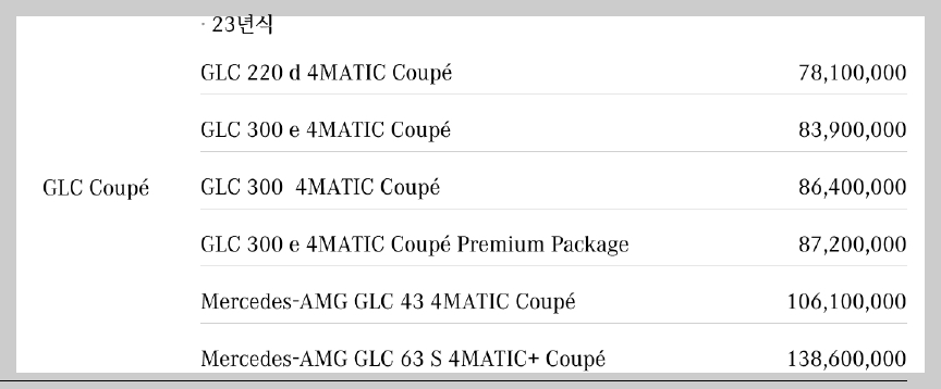 GLC 300 4 MATIC은 2023년 기준 8,640만 원입니다.