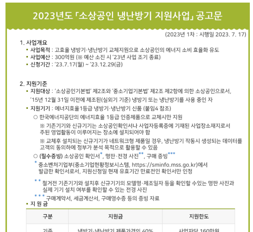 이때 노후된 에어컨을 한국에너지공단의 에너지효율 1등급 인증제품으로 교체 시만 지원하며 이전기기와 신규기기는 소상공인확인서나 사업자등록증에 기재된 사업장소재지로서 주된 영업활동이 이루어지는 장소에 설치되는 조건임