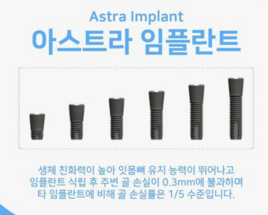 스웨덴 기업인 아스트라제네카에서 만든 아스트라 임플란트는 세계 3대 임플란트로 꼽힙니다.