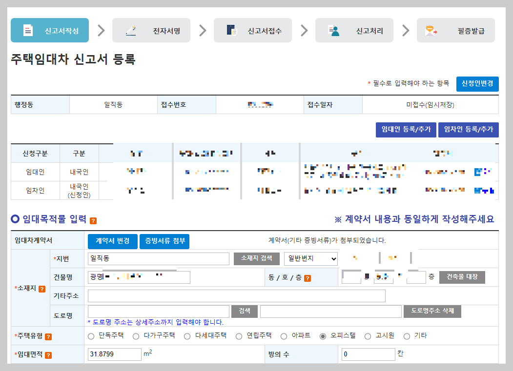 3. 계약서를 보면서 차례로 임차인정보, 임대목적물(집) 정보, 임대계약에 관한 정보등을 입력합니다.