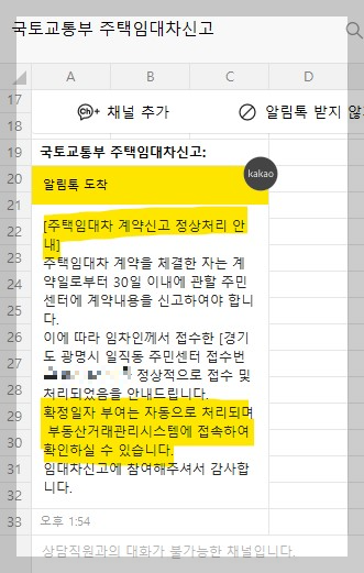 주택임대차 신고를 완료하고 나면 3시간 이내로 아래와 같은 국토교통부 주택임대차 신고 알림톡을 받았습니다.