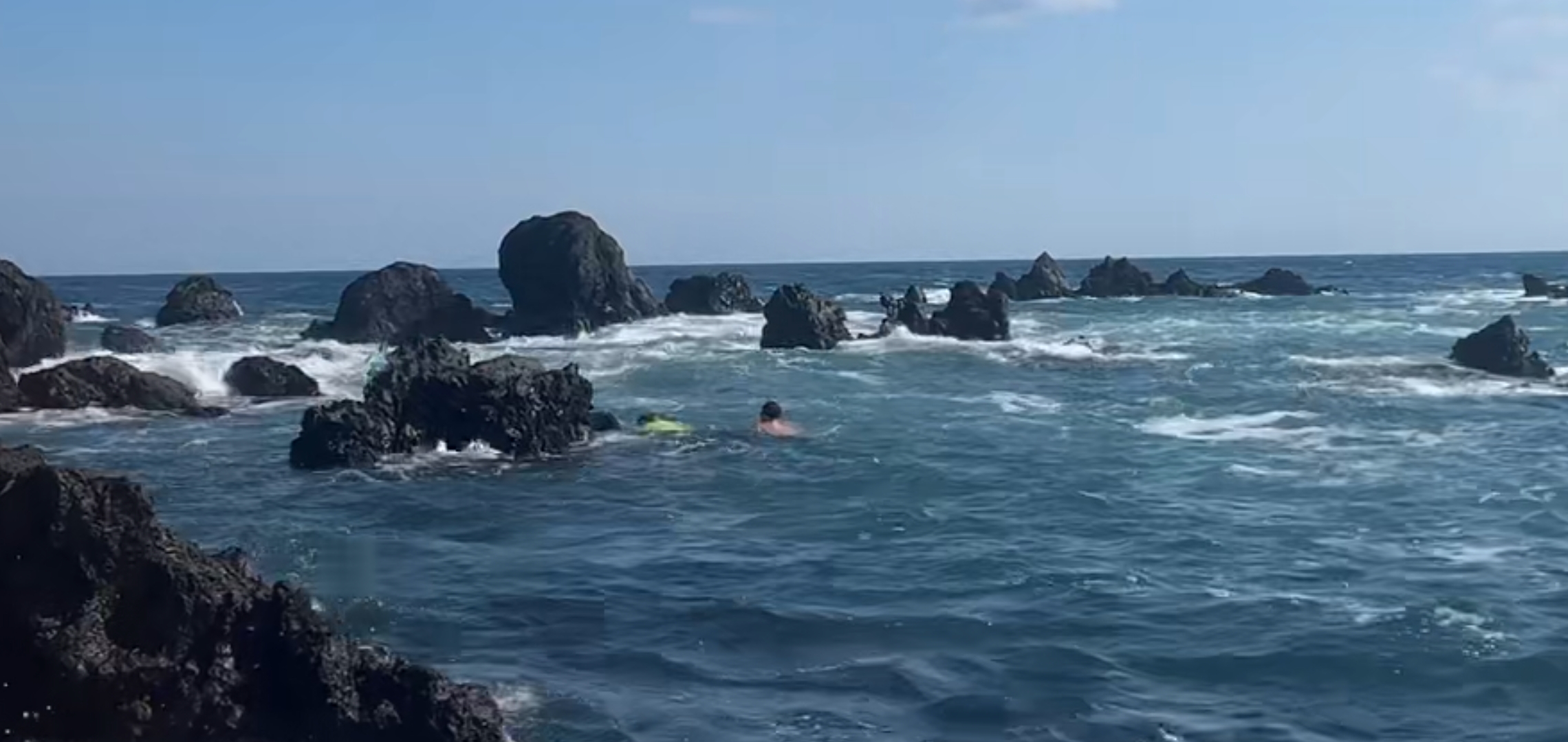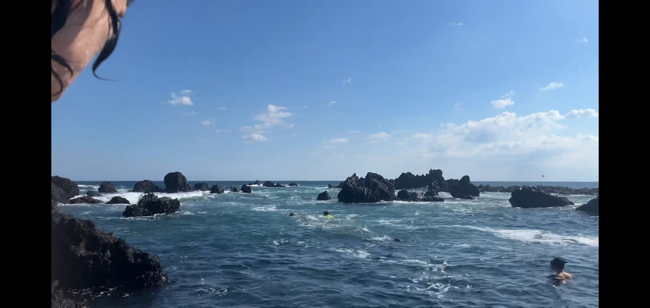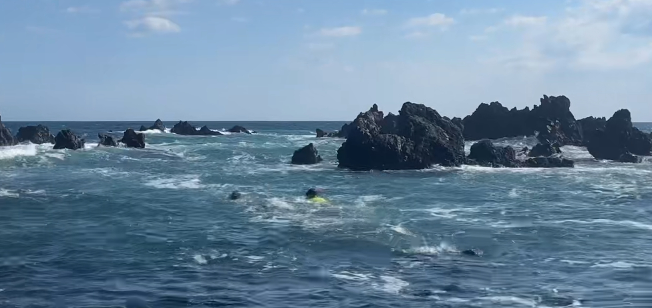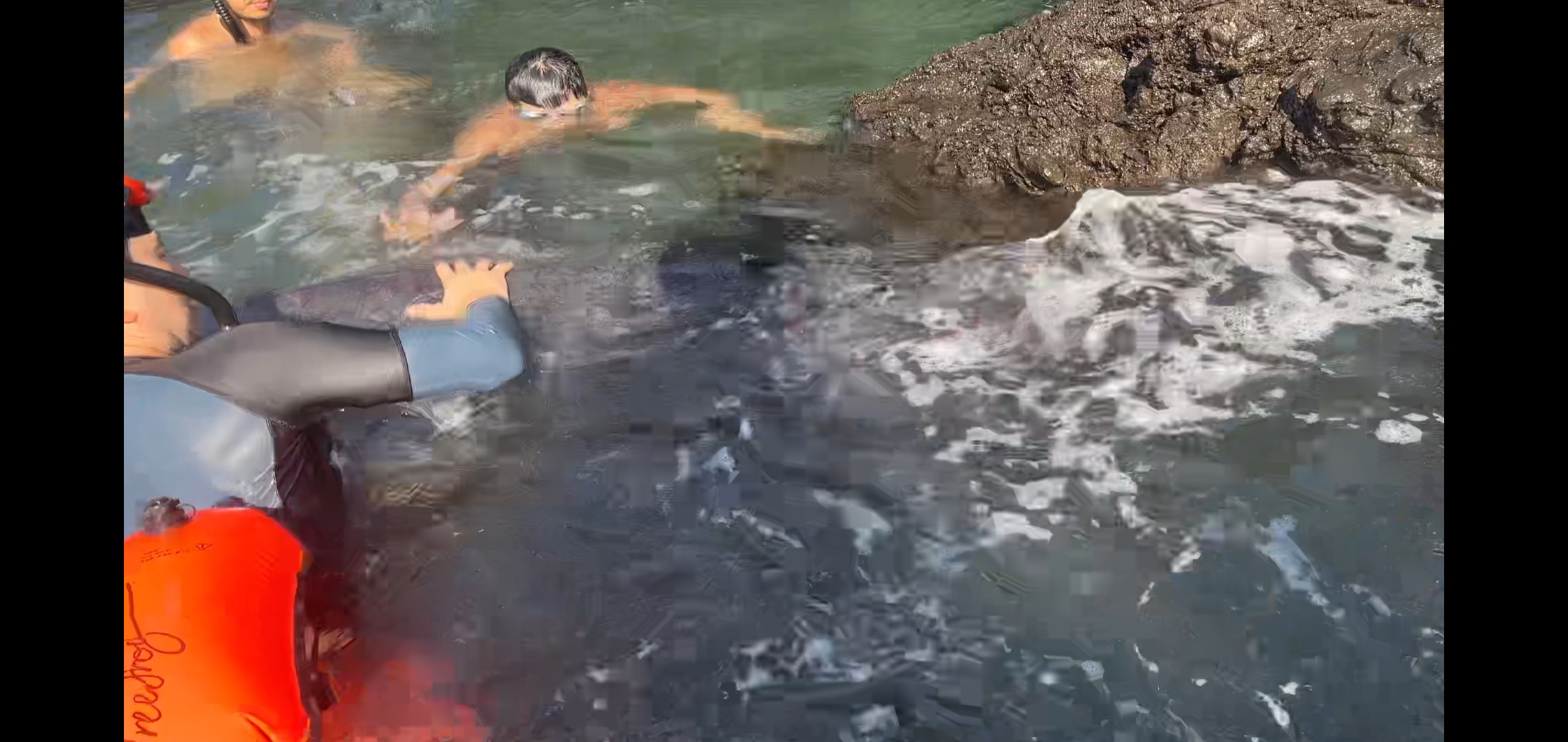 파도가 너무 거세져서 물안경만 쓰고 있던 다른 사람은 자리에 멈춰 섰고,