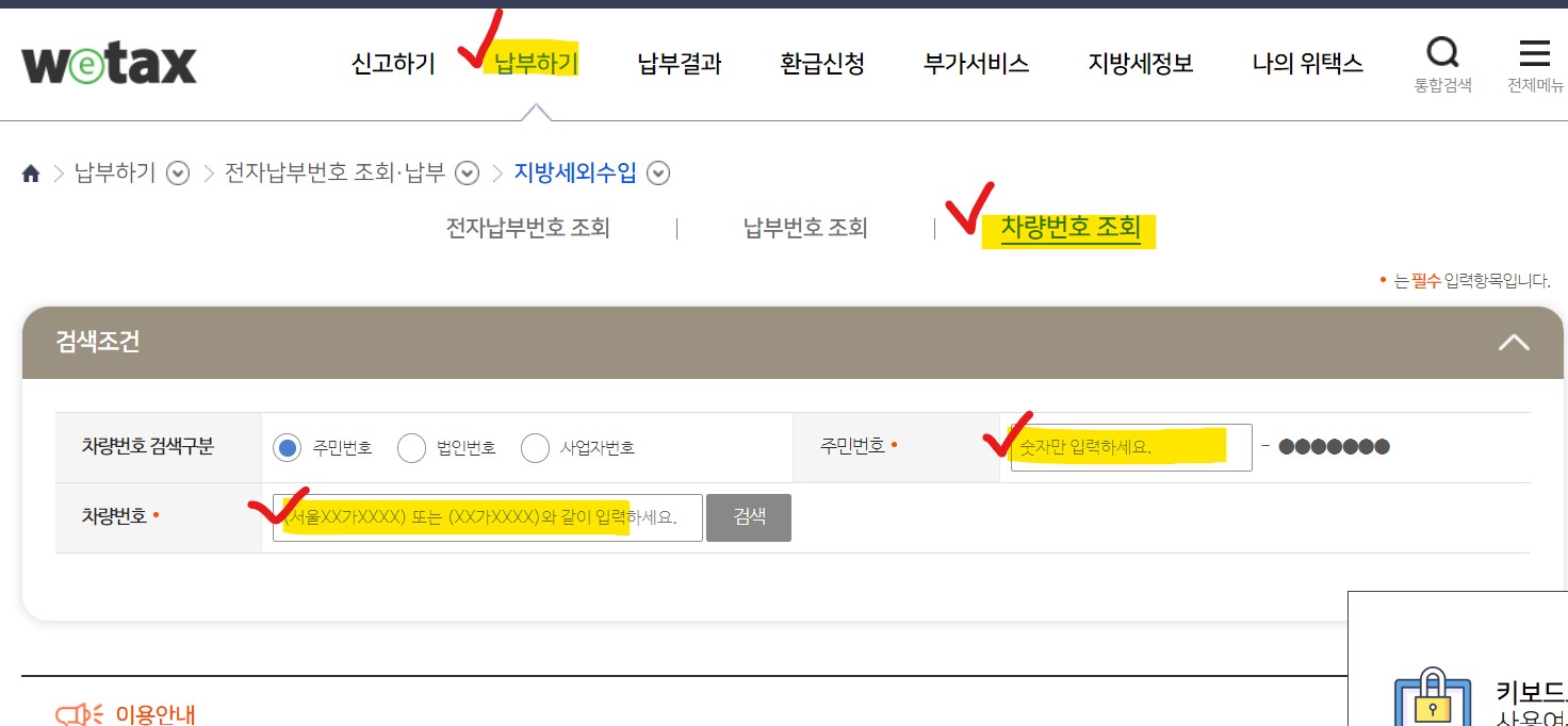위택스 -> 납부하기 -> 지방세 외 수입 -> 차량번호조회 클릭 -> 주민번호앞자리와 차량번호 입력 후 조회