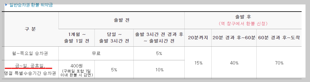 명절 추석표 기차예매는 공휴일이므로 주말(금~일, 공휴일) 기준 위약금이 적용됩니다.