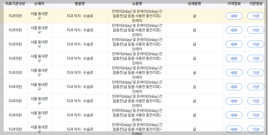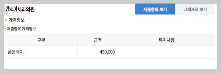 조회결과 아래처럼 치과마다 천차만별인 가격을 확인할 수 있었습니다.