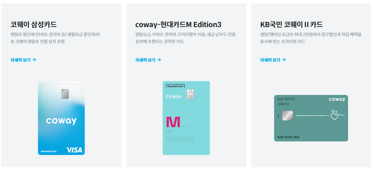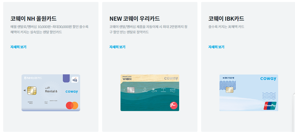 카드사제휴할인은 월 카드사용금액에 따라 카드사별로 다르니 코웨이 홈페이지에서 확인가능합니다.