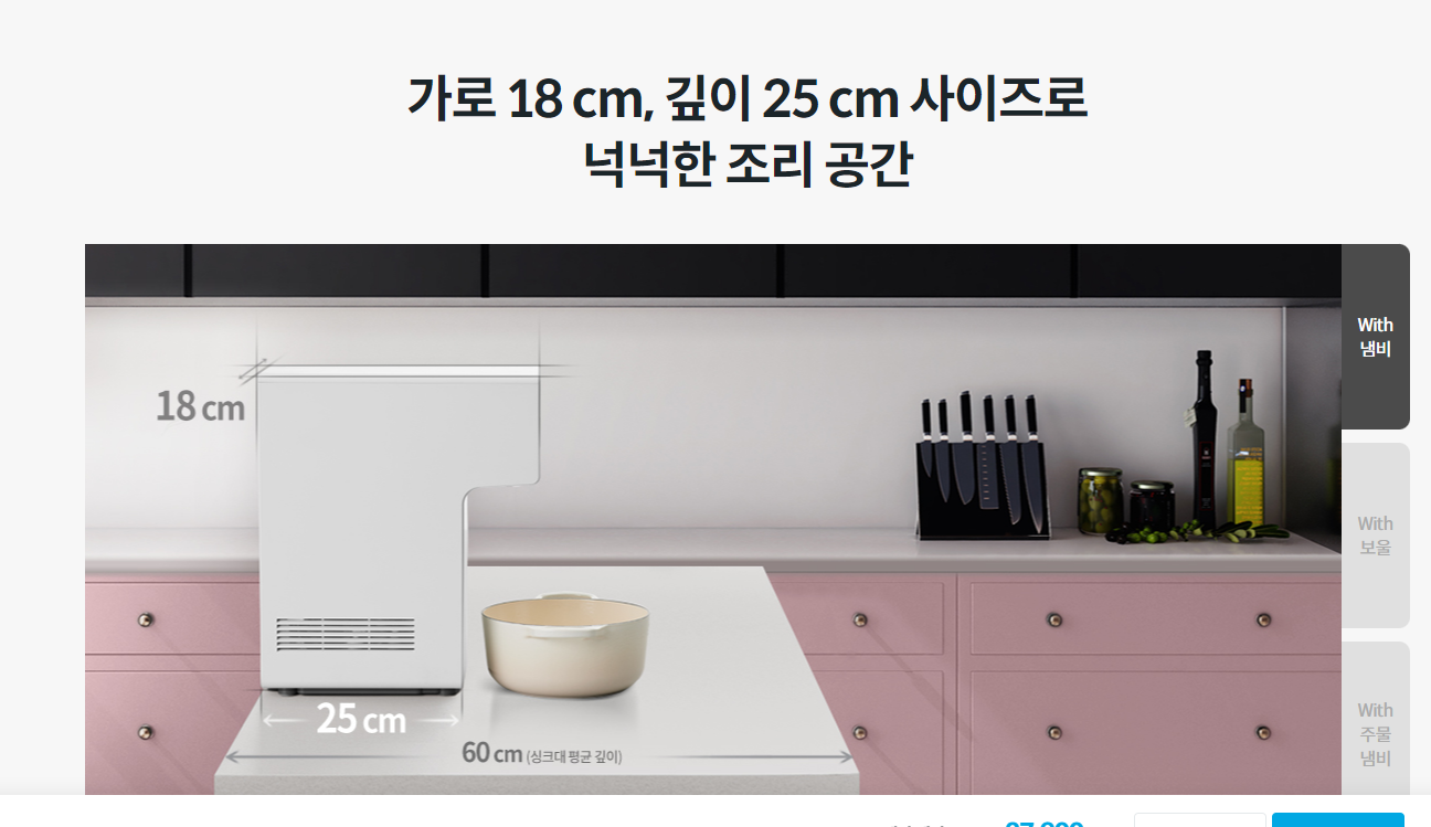 여름에 시원한 물 한잔 바로 마실 수 있고 온수기능이 있으면 tea나 커피를 만들 때 커피포트가 필요 없기 때문에 주방도 더 미니멀하게 쓸 수 있겠다고 생각했습니다.