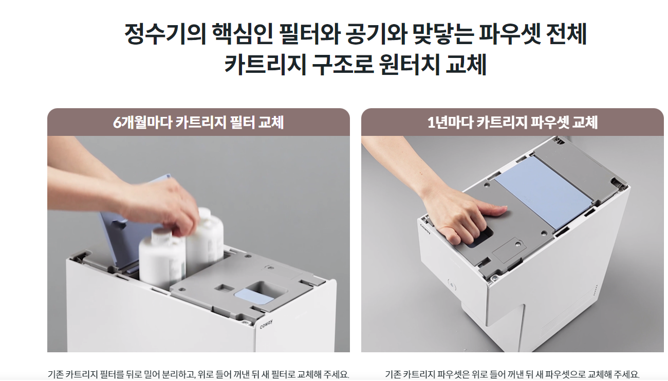 6개월마다 카트리지 교환키트를 보내주며 1년마다 카트리지파우셋 전체를 교환할 수 있는 키트를 보내줍니다