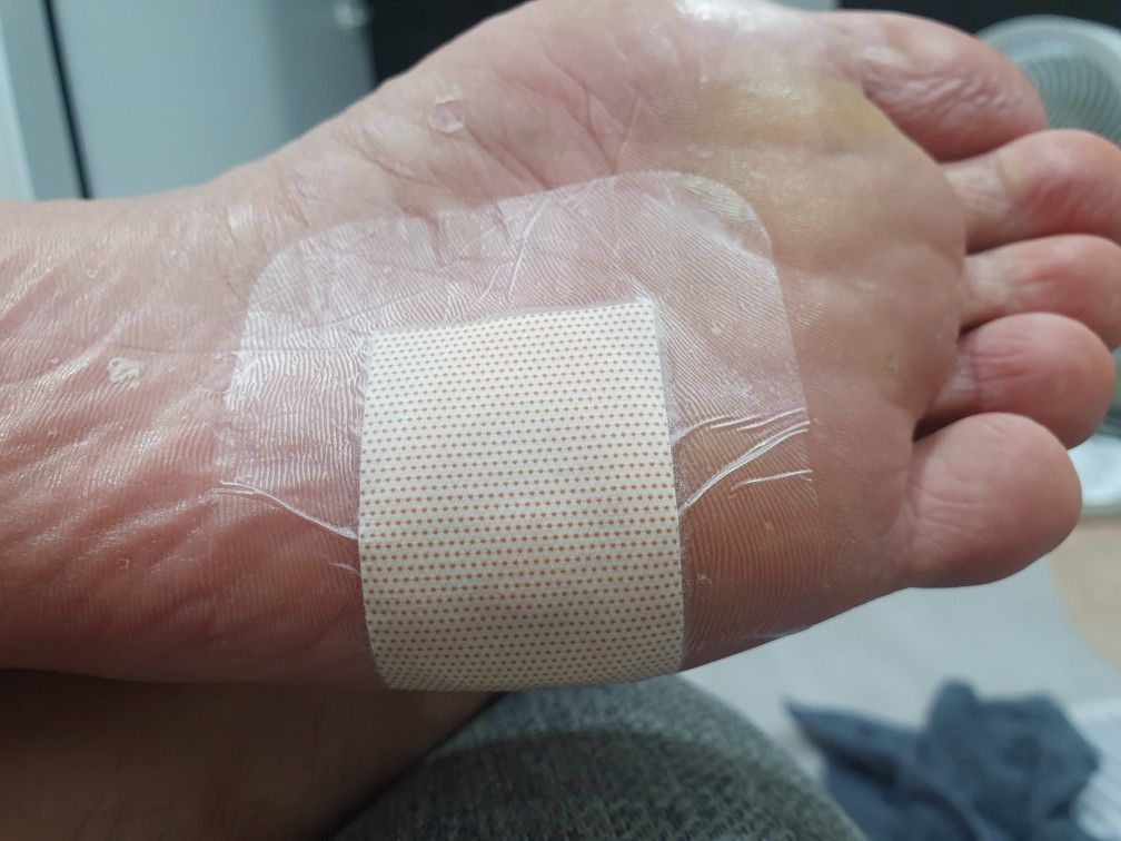 주의사항! 꼭잡아주세요! 그 위로 방수엔 드레싱밴드를, 티눈밴드를 다 덮을 수 있도록 주의해서 붙여줍니다. 방수밴드는 두께가 얇아서 서로 달라붙는 경우가 많으니 주의해 주세요! 생각보다 접착력이 강해서 서로 붙어버리면 재사용하기가 어렵습니다!! 주의!!