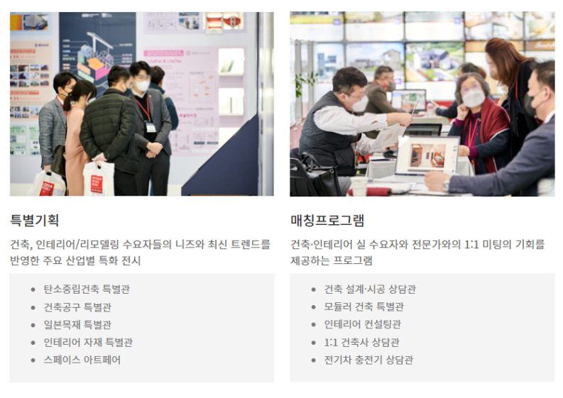 평소 건축이나 인테리어등에 관심이 많다면 국내최대 참가기업이 모이는 코리아빌드 건축박람회에 다녀와 업계의 최신기술 동향파악과 제품 정보를 알아두시면 크게 도움이 될 것입니다. 저는 전원주택에 관심이 많아서 다녀올 예정인데요, 건축주 설계 시공 1:1 맞춤형 상담도 해준다고 하니 여러 궁금증과 고민들을 해결하고 인테리어 자재 및 소품들에 대해 다양한 아이디어를 얻을 것 같은 기대가 됩니다.