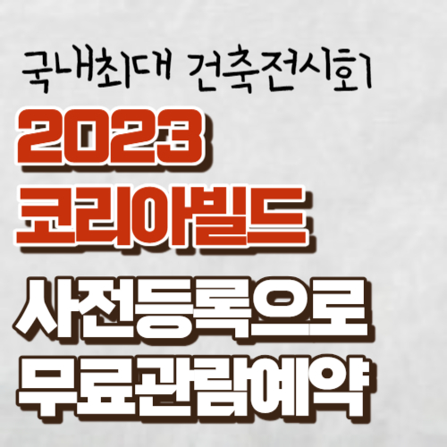 2023년 국내최대 건축박람회인 코리아빌드가 코엑스에서 열립니다. 8월 3일(목)부터 8월 6일(일)까지 4일에 걸쳐 건축산업과 연관산업이 총망라되어 600개사 총 1700부스 규모의 대형전시회입니다. 입장료 2만 원입니다 다만, 사전등록에 한해 무료관람 가능합니다. 사전등록하는 방법과 전시품목들에 대해 알아보겠습니다.