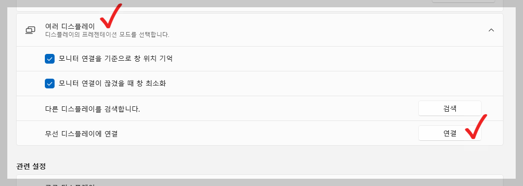2. 여러 디스플레이를 펼쳐주고 "무선 디스플레이 연결"에서 연결을 클릭합니다.